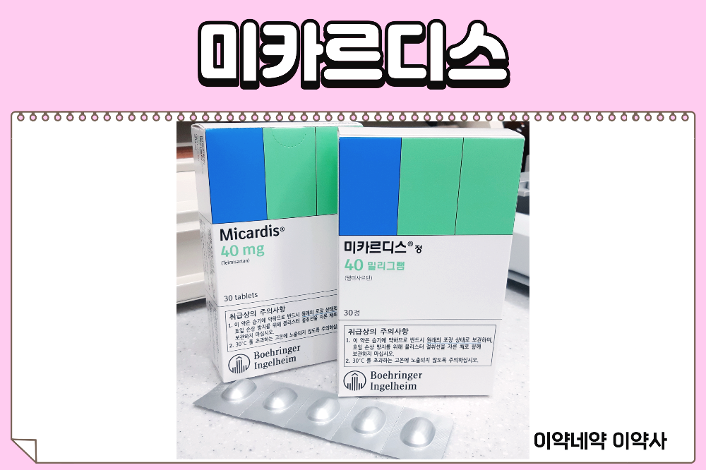 오늘 알아볼 제품은 텔미사르탄 단일 성분으로 이루어져 고혈압 치료에 사용되는 미카르디스 정 40mg입니다. 텔미사르탄은 이전에 알아보았던 칸데사르탄 성분과 사촌 격인 성분으로 ARB계로 분류되는 혈압 강하 성분입니다.